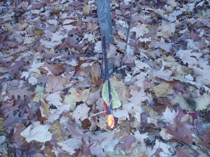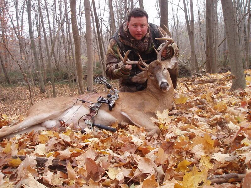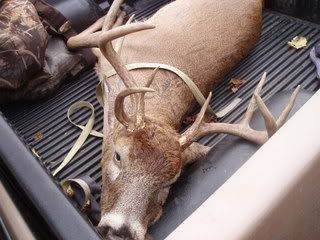 Got out this morning and crossed the creek to hunt the south side of the woods. As I climbed up to around 20 feet high I began pulling my bow up at 5am central and here comes a large buck behind me. Must have enjoyed the doe urine I sprayed on my waders because he came right to me. About 15 minutes before sun up a six point was closing the distance and an eight pointer was letting him know who was boss with the cock-eyed look he gave. They were both making their way up wind when they noticed a nice doe come out near me. Both high-tailed it to the doe and began chasing her and a few more that decided to come in. Got a nice shot on this 9 pointer just about at sunrise. Not a great shot but only went 20 yards and fell over. Still two other smaller bucks one six and one eight were unsure what happened. Four more does came in and could have taken any of them. As I grabbed my binoculars my bow decided to take a dive 20 feet to the ground. Oh well at least got the shot off before that happened.