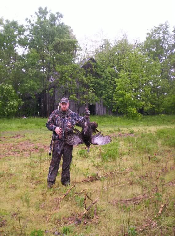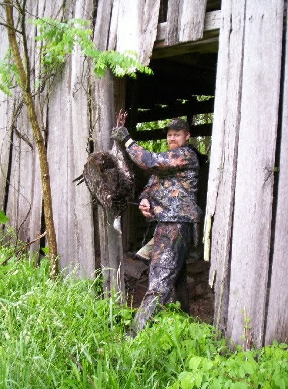 You see, it had been a long hard ordeal getting to this point, just to have this opportunity. It all started two weekends ago when JRB and I decided to go turkey hunting down in his neck of the woods. Well, not just hunting for any type of turkey, we wanted the ultimate BIRD. We decided that obviously the perfect bird would weigh between 12 and 14 lbs when soaken wet, yet still have a decent 8-9 inch beard. We chose these characteristics for obvious reasons. A 12-14 lb bird will certainly be more tender, juicy and taste better than a big old 25lb bird. However a decent beard is a must, since that is the best way to determine the worth of your Trophy. So the stage was set. We would strike out across the county in search of the Ultimate bird, and we would not stop until we reached our goal.or until my wife said I had to come home. The first weekend we were met with unfavorable weather, and uncooperative birds, coupled with the fact that we had to drive by the Cingular building each hour to see if the cellphone chick was working. So I left that weekend, kinda down, but not defeated. The plan was to return for the final weekend of the season and accomplish our goal. After finally getting over the flu this week, I managed to make it down to Jasons for one last run at our quest. The Ultimate Bird. Much to our displeasure, we were again met with unfavorable weather. This, however did not dampen our spirits, we knew that if this task could be done, we were the two to pull it off. After all, Jason had hunted turkeys a time or two before, and I had watched a turkey hunting dvd almost all the way through one time. So we knew what we were doing, it was just a matter of gettin-r-dun. By late Saturday morning we knew that it was time to get serious. We had about had our fill of near misses. We would constantly see BIG old undesirable Toms strutting around or perfect sized Jakes sporting small undesirable beards, but no birds that met our Ultimate standards. About 11:00 that morning is when we began to close in on a Perfect Bird prospect, in a pouring rain. We knew that moving in on this bird would take some expert stalking across some rugged terrain, but we also knew that the reward would be satisfying. Our stalk ended nearly a mile from the truck, in an old abandoned tobacco barn. We had put ourselves within calling range of the great bird, so Jasons began his clucking serenade, as I readied myself. I placed my Benelli through one of the cracks between two of the pieces of barn siding and waited. As I peered through the small opening out into the pouring rain, I realized that we had done it, we had finally found that perfect turkey. It was the one we had been looking for, that one in a thousand bird, the one that we had set our goals for. The bird seemed to come in on a string, closer and closer. During its final few steps, a cluck from JRB raised the birds neck perfectly and the symultanious boom of the 3 and a half inch number 4s sealed the birds fate. Mission accomplished.